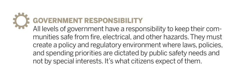 One example that came up several times was the need to mandate automatic fire sprinkler systems in all new and existing high-rise buildings. According to research done by NFPA, fire Sprinklers have been shown to be an extremely effective of increasing life safety with an 89% reduction in fire deaths in properties with automatic fire sprinklers as compared to those without. So, sprinklers would certainly make an impact on reducing deaths in fires. NFPA 1 Fire Code requires automatic fire sprinklers systems in all new high-rise building and all existing high-rise buildings within 12 years of the code becoming law. Mandating compliance with the most recent edition of this code through legislation falls under government responsibility cog.