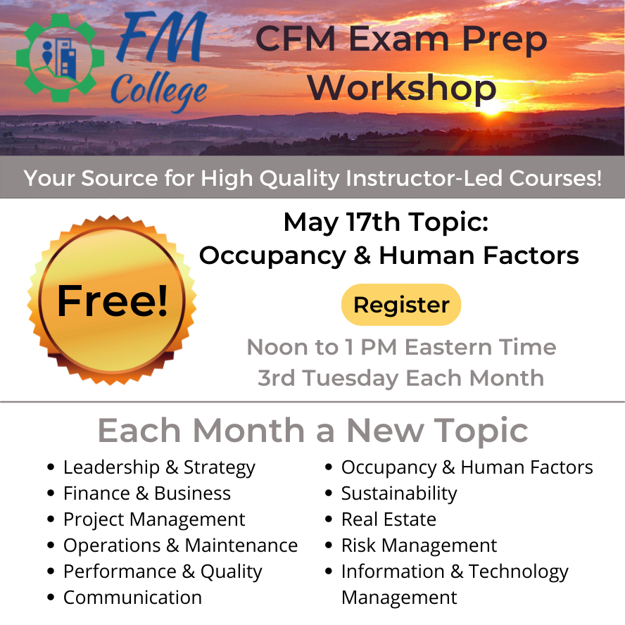Prepare for the Certified Facility Manager Exam developed by IFMA! June 21st Topic: Risk Management >>> How to prepare for a "Competence" Exam as compared to a "Knowledge" Exam >>> Risk Management Risk Management Planning Emergency Preparedness Response & Recovery Facility Resilience Business Continuity >>> About FM College's Online and In-Person Courses Course Info