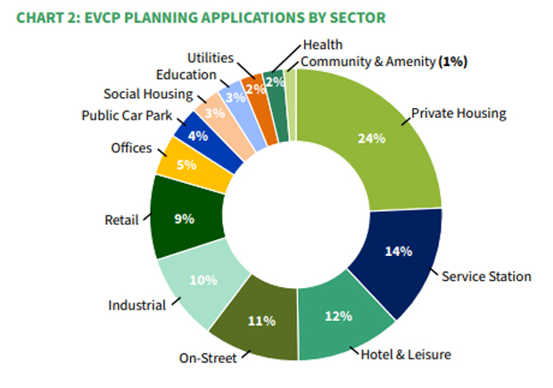 Private housing developments comprise the highest proportion of applications by far (24 per cent), with On-street, Service Stations, Industrial and Hotel & Leisure all hovering around the 10-15 per cent mark. Installations for Social Housing, Public Car Parks, Utilities, Health, Community & Amenity and Education all scored below five per cent.